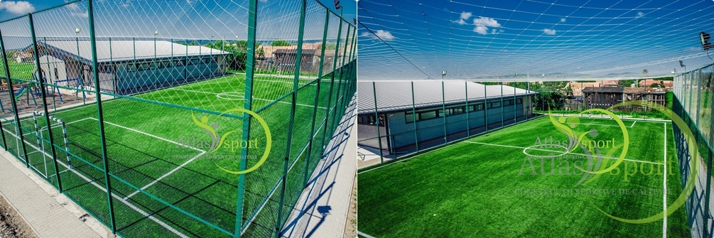 Suprafaţa de joc este realizată cu gazon sintetic de 4 cm grosime.