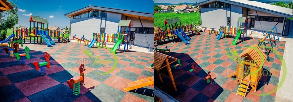 În zona de siguranţă a echipamentelor de joacă s-au montat dale de cauciuc.