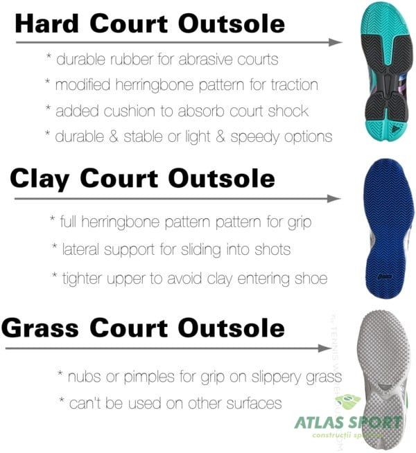 Ceea ce face diferenţa în principal este talpa. O talpă exterioară a unui pantof sport pentru suprafeţele din zgură va avea în mod obişnuit un model de de zigzag pe toată suprafaţa, care oferă o adevărată aderenţă pe suprafeţele alunecoase.